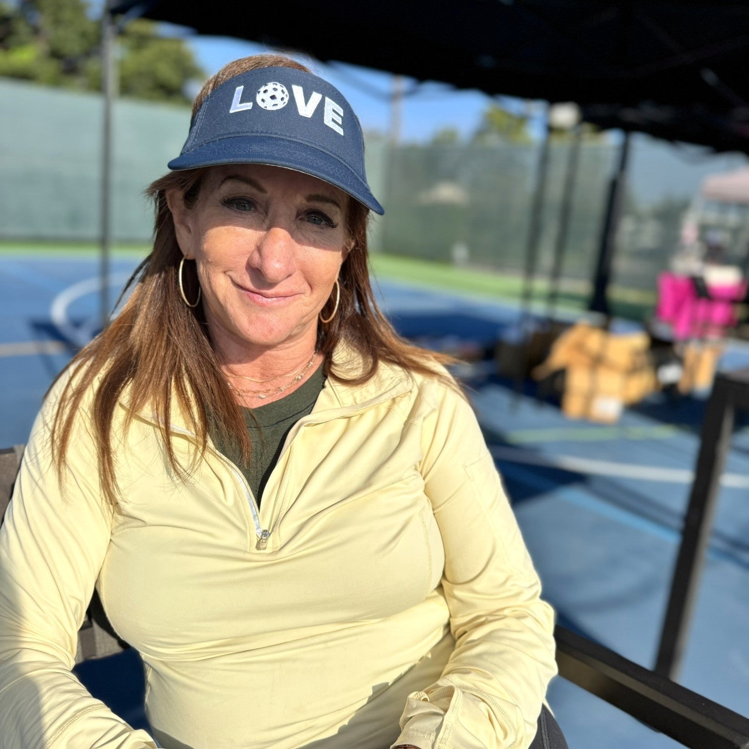 Blue visor with embroidered “LOVE” pickleball-themed design